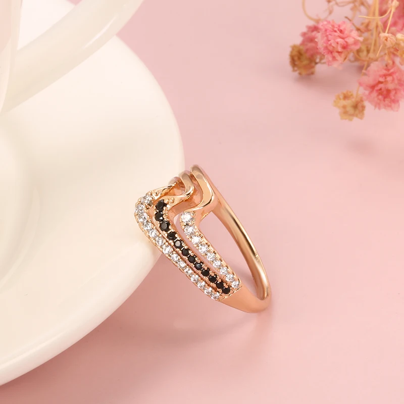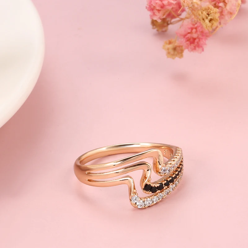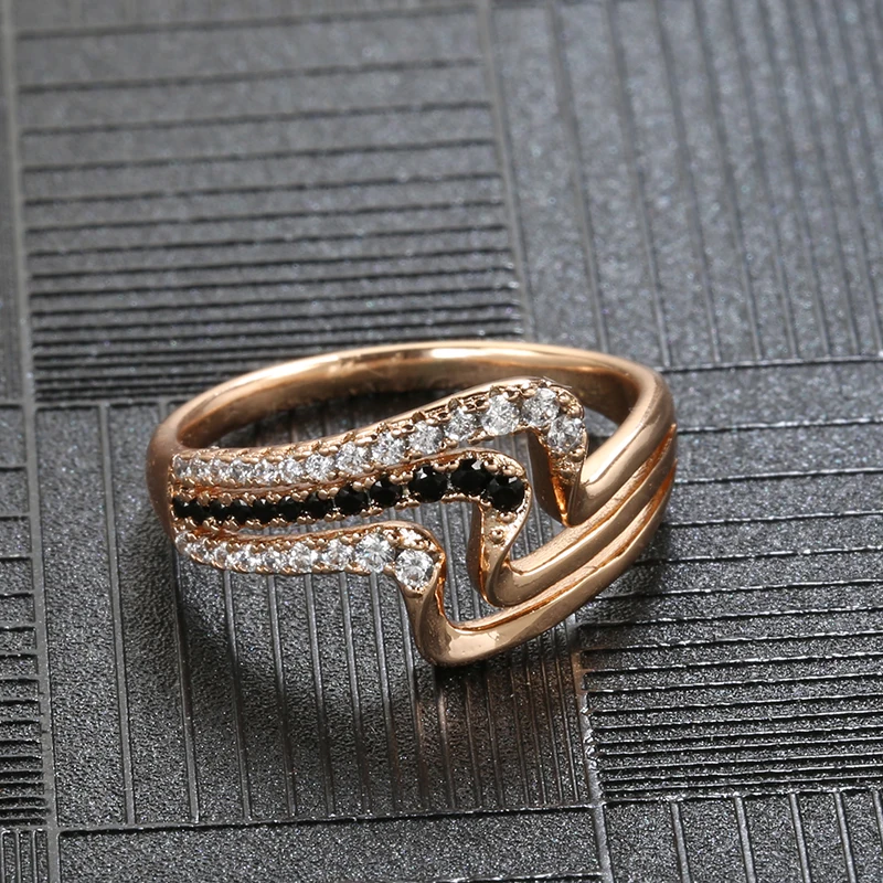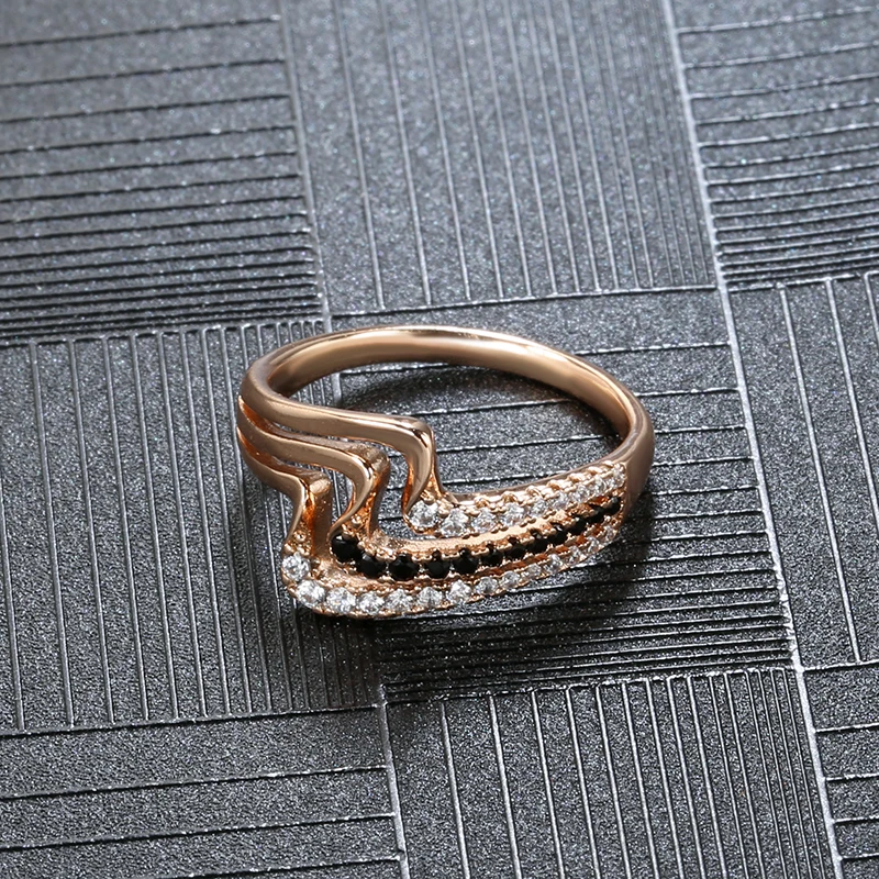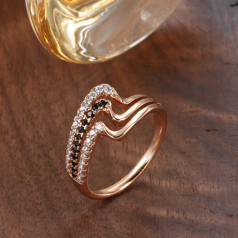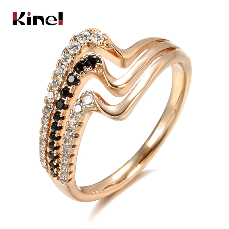Kinel Luxury 585 Rose Gold Natural Black Zircon Ring Fashion 3 Rows Waves Rings for Women Vintage Wedding Jewelry