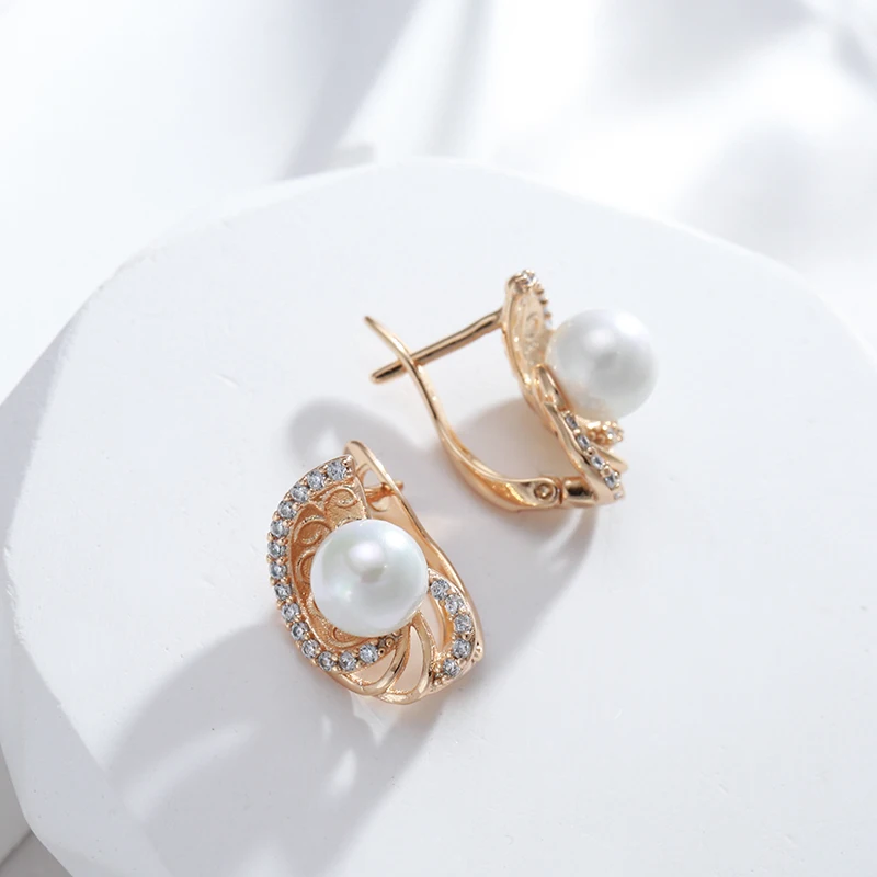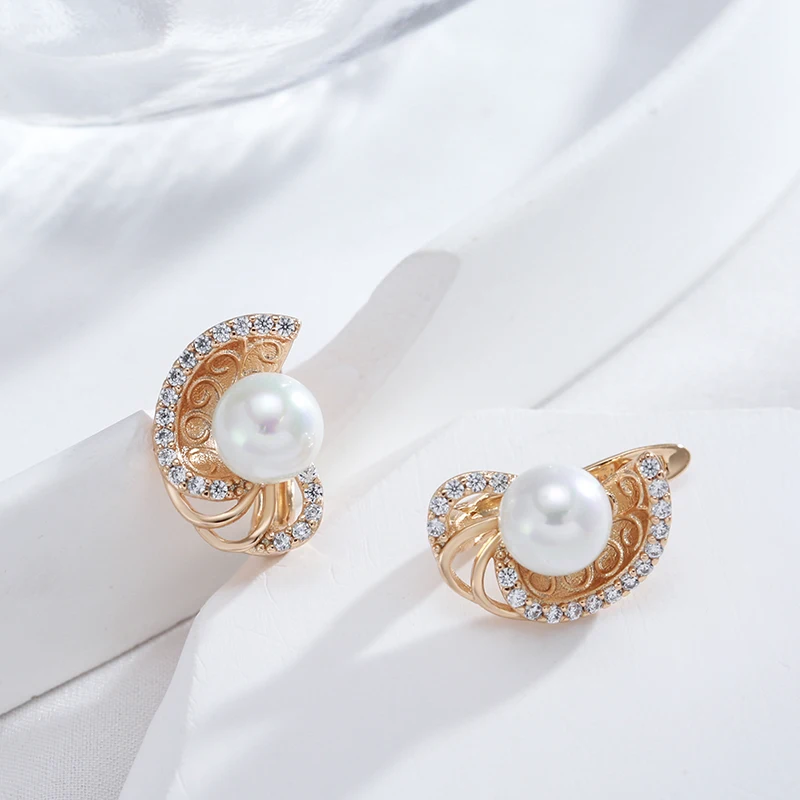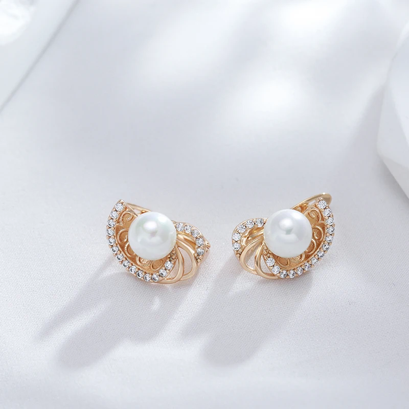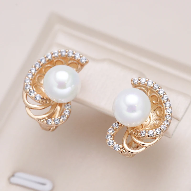 Kinel New Round Pearl Dangle Earrings for Women 585 Rose Gold Color Flower Ethnic Bride Earrings Lovely Fashion Daily Jewelry