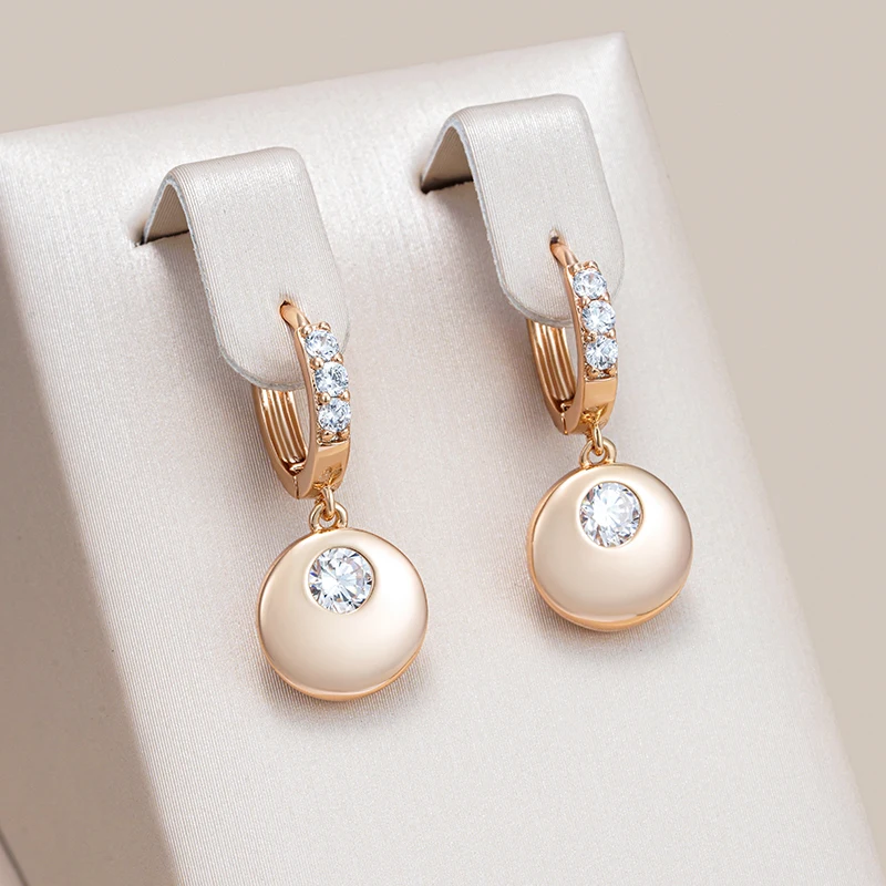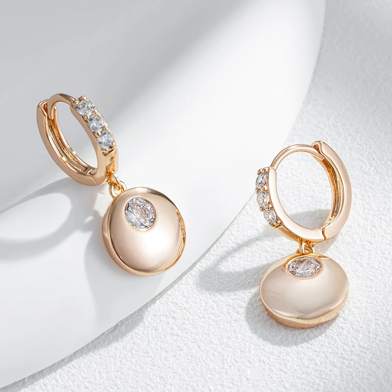 Kinel Fashion Simple Glossy Round Coin Dangle Earrings Women 585 Rose Gold Color With Natural Zircon Party Daily Fine Jewelry