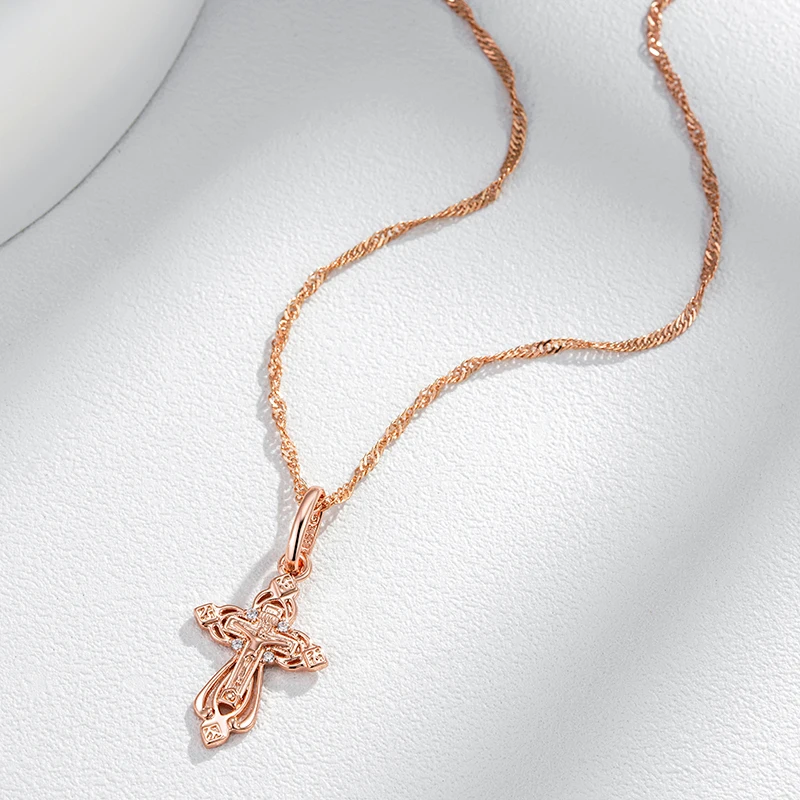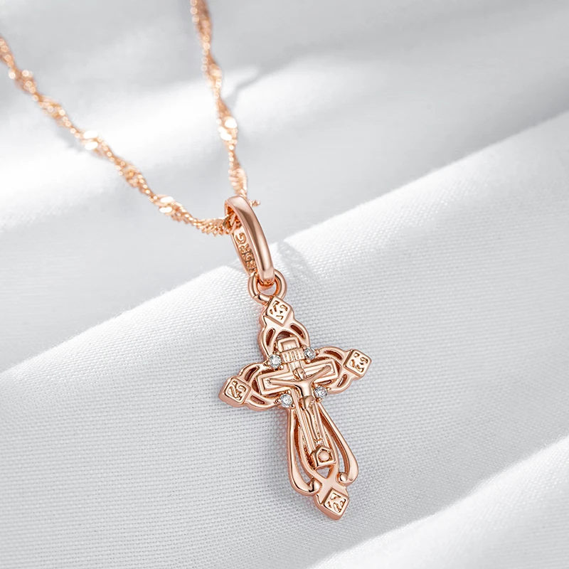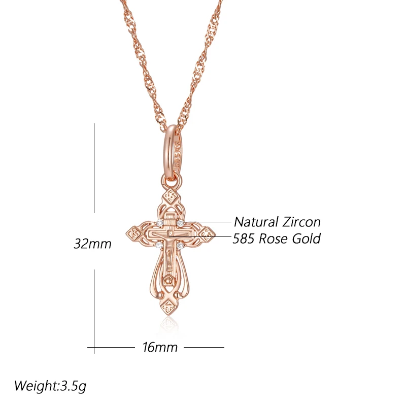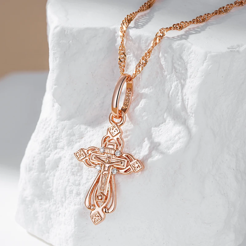 Kinel Luxury 585 Rose Gold Color Natural Zircon Cross Pendant Necklace For Women Orthodox Church Jesus Charm Daily Fine Jewelry