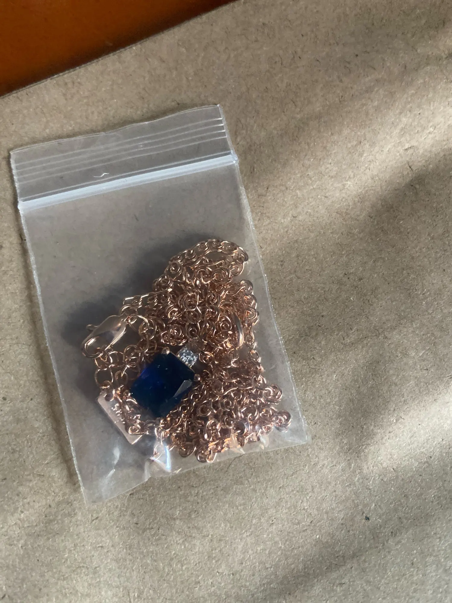 This piece is crafted from Copper & 585 Rose Gold and features round-cut natural zircon sapphire for a stunning finish.