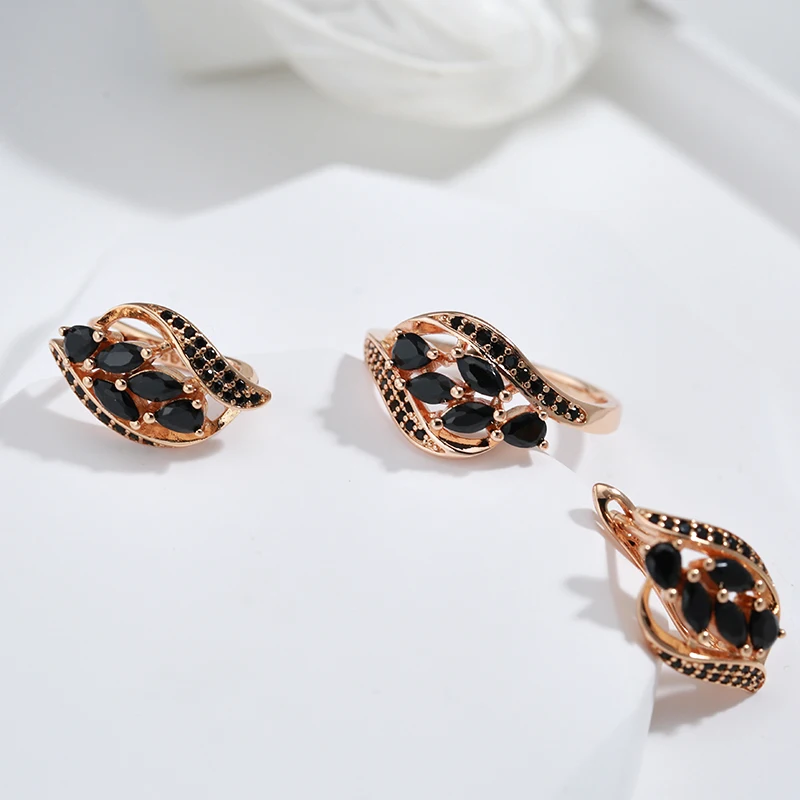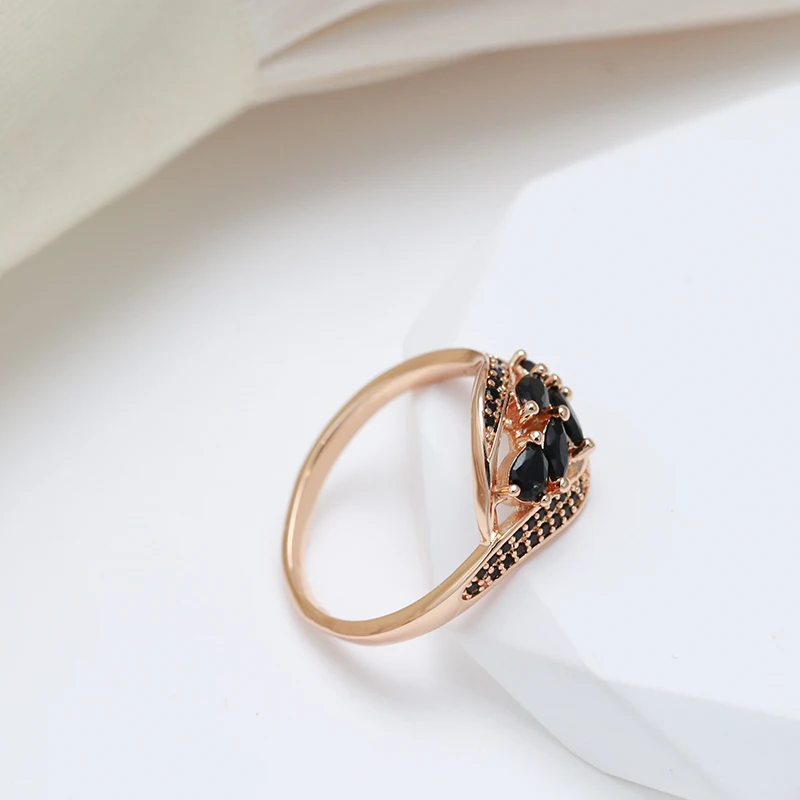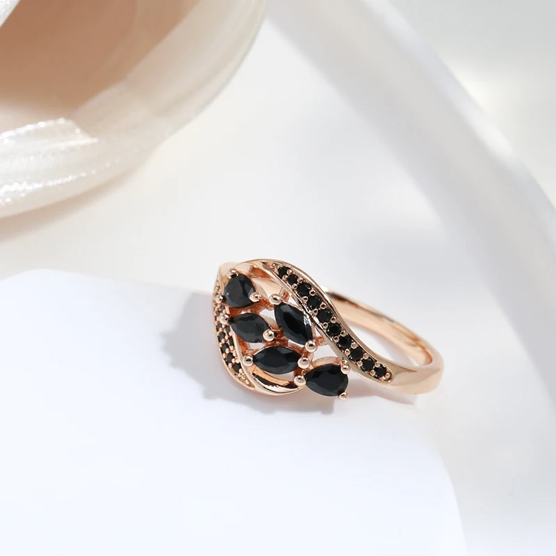 Kinel New Unusual 585 Rose Gold Leaf Ring Inlay Bling Black Natural Zircon Ring for Women Elegant Fine Vintage Wedding Jewelry