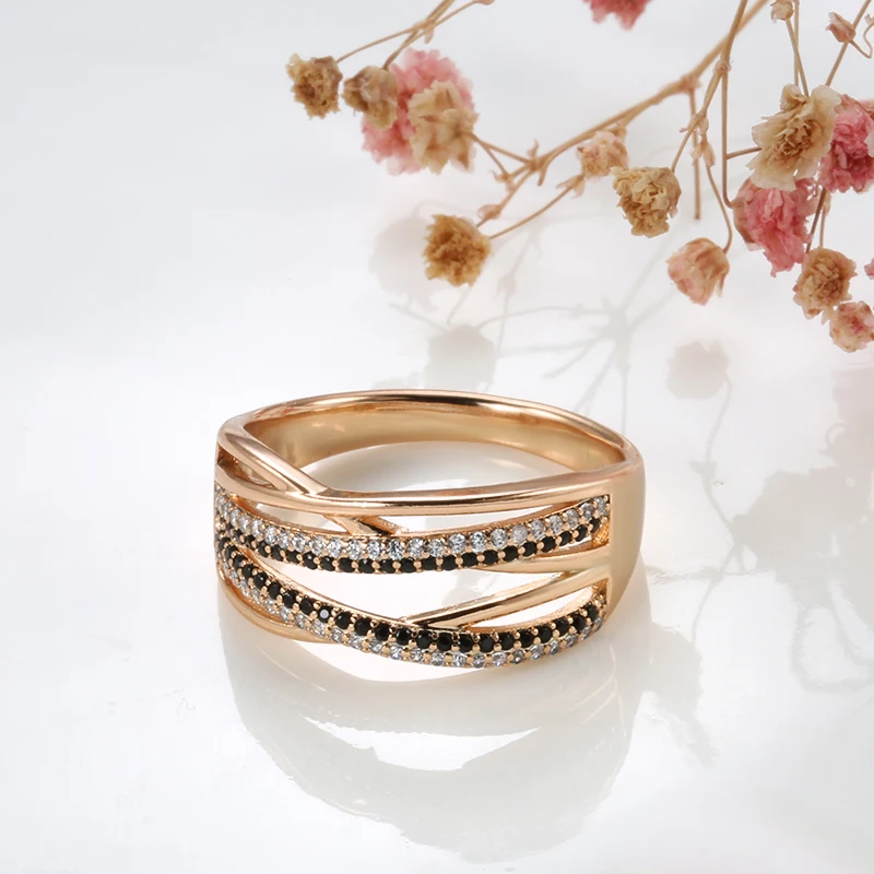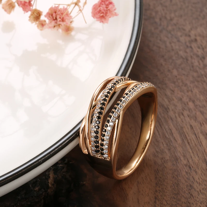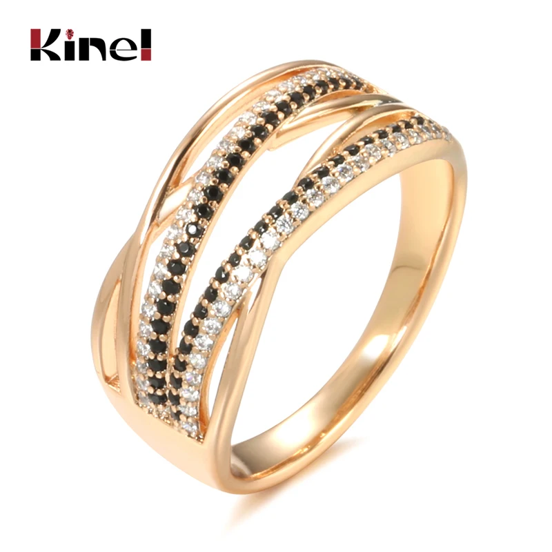 Kinel Natural Black Zircon Cross Ring 585 Rose Gold Geometric Hollow Line Wedding Rings for Women Vintage Fashion Jewelry